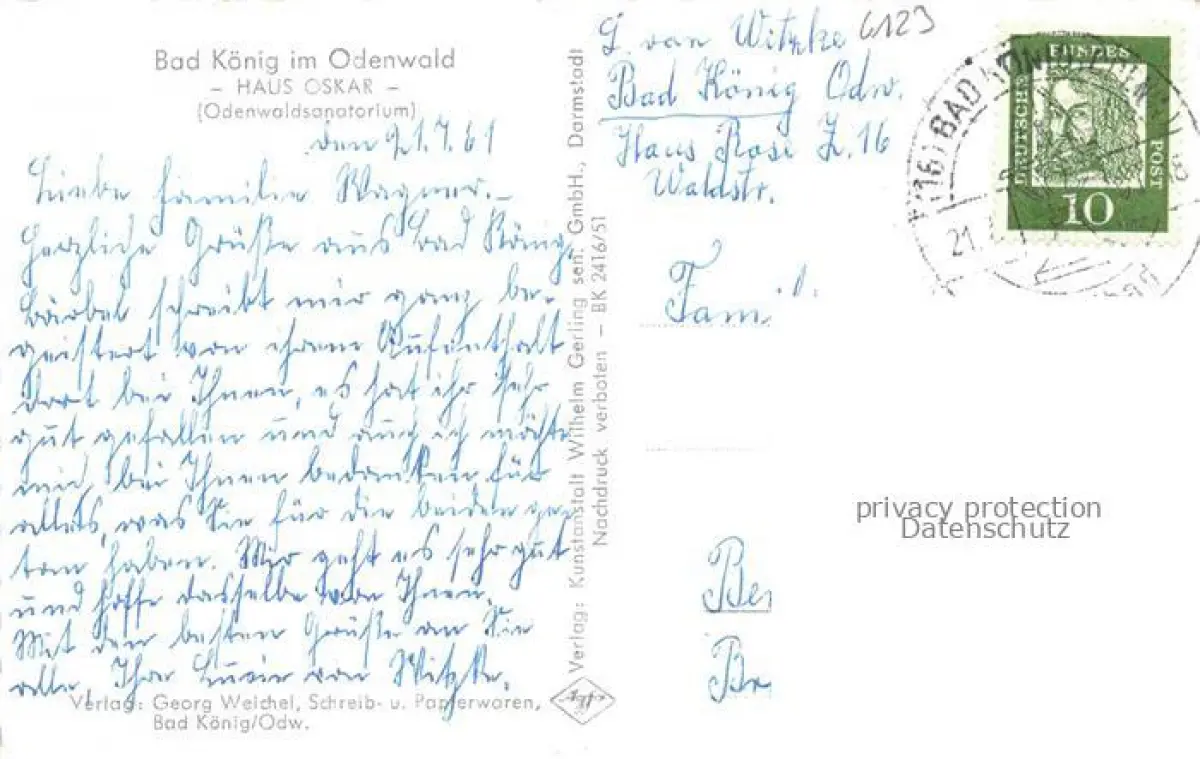 alte Postkarte Bad Koenig Odenwald Hessen Haus Oskar Odenwaldsanatorium postalisch gelaufen Erhaltung siehe scans [WerneD78]