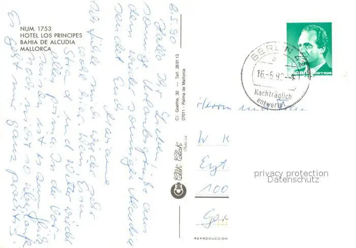 Bahia_de_Alcudia Hotel Los Principes Strand Tretboote Bahia_de_Alcudia postalisch gelaufen 1990 Erhaltung siehe scans [WerneD78] WernPID7