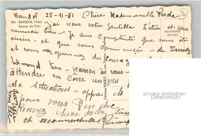 Bandol Entrée du port Cote d'Azur Bandol postalisch nicht gelaufen 1951 Erhaltung siehe scans [FriedD77] Frierer
