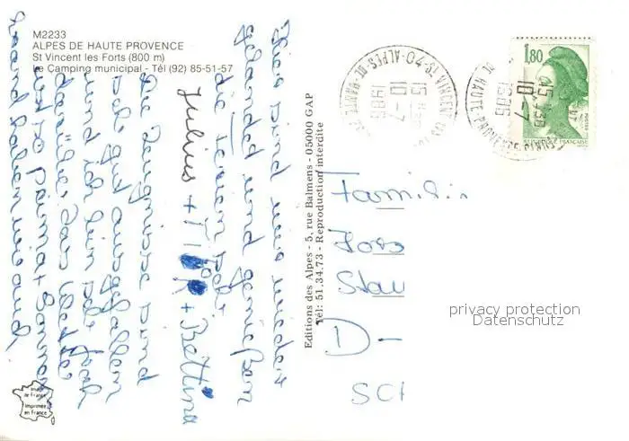 Barcelonnette Camping municipal Saint Vincent les Forts Barcelonnette postalisch gelaufen 1985 Erhaltung siehe scans [KathaD81] Kathoren