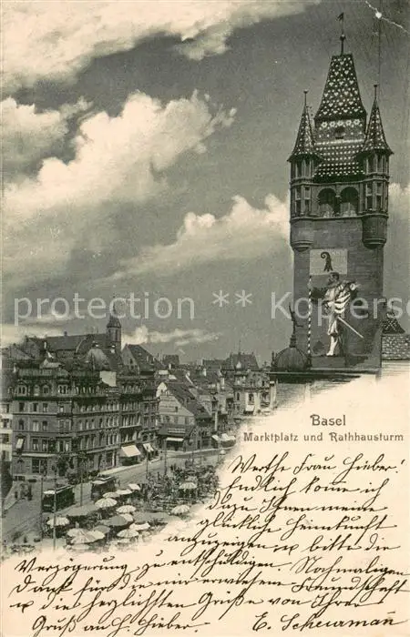 Basel_BS Marktplatz und Rathhausturm Basel_BS postalisch gelaufen 1904 Erhaltung siehe scans [WerneD78] WernPID7