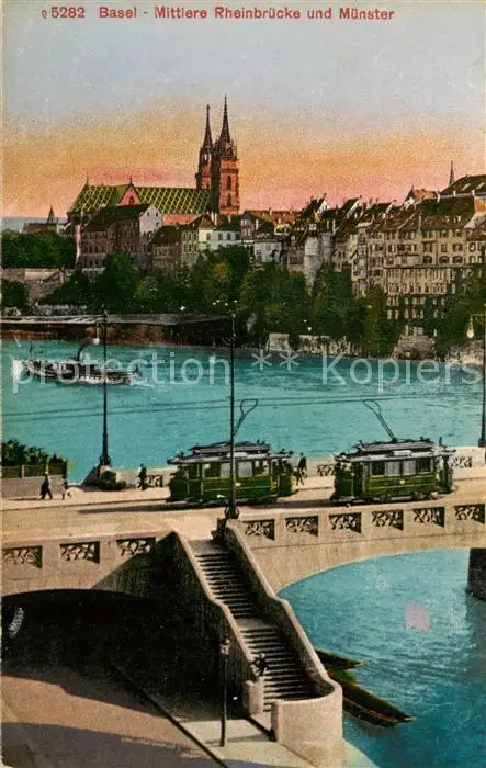 AK / Ansichtskarte Basel_BS Mittlere Rheinbruecke Strassenbahn Muenster Basel_BS