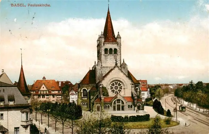 AK / Ansichtskarte Basel_BS Pauluskirche Aussenansicht m. Strassenbahn Basel_BS