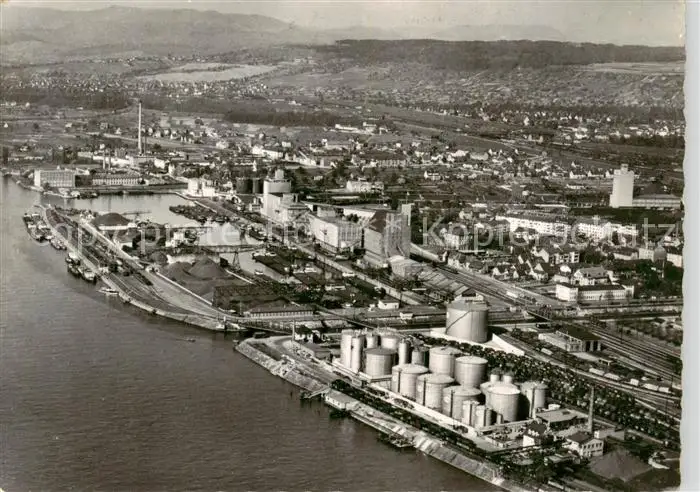 Basel_BS Rheinhafen Basel_BS postalisch gelaufen 1953 Fliegeraufnahme Erhaltung siehe scans [FriedD77] Fliegeraufnahme Frierer