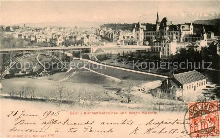 Bern_BE Kirchenfeldbruecke und historisches Museum Bern_BE postalisch gelaufen 1906 Erhaltung siehe scans [FriedD77] Frierer