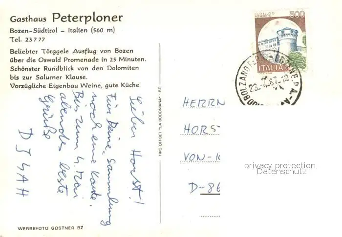 Bozen_Suedtirol Gasthaus Peterploner Bozen Suedtirol postalisch gelaufen 1987 Erhaltung siehe scans [WerneD78] WernPID7