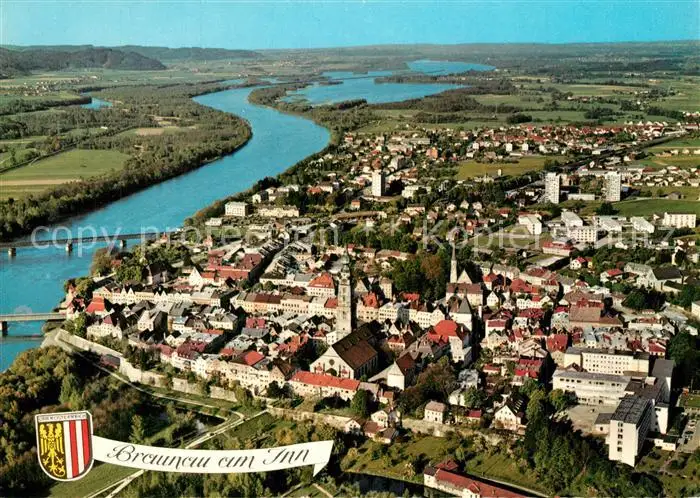 AK / Ansichtskarte Braunau_Inn Fliegeraufnahme mit Enknachmuendung Innstausee Kraftwerk Ehring Frauenstein Stadtpfarrkiche Stephansmuenster Braunau Inn