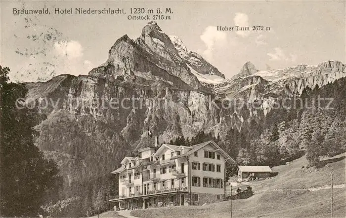 AK / Ansichtskarte Braunwald_GL Hotel Niederschlacht Aussenansicht u. Hoher Turm Braunwald GL