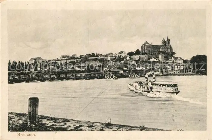 Breisach_Rhein Partie am Rhein Schiffsbruecke Dampfer Blick zum Muenster Breisach Rhein postalisch gelaufen 1921 Erhaltung siehe scans [FriedD77] Frierer