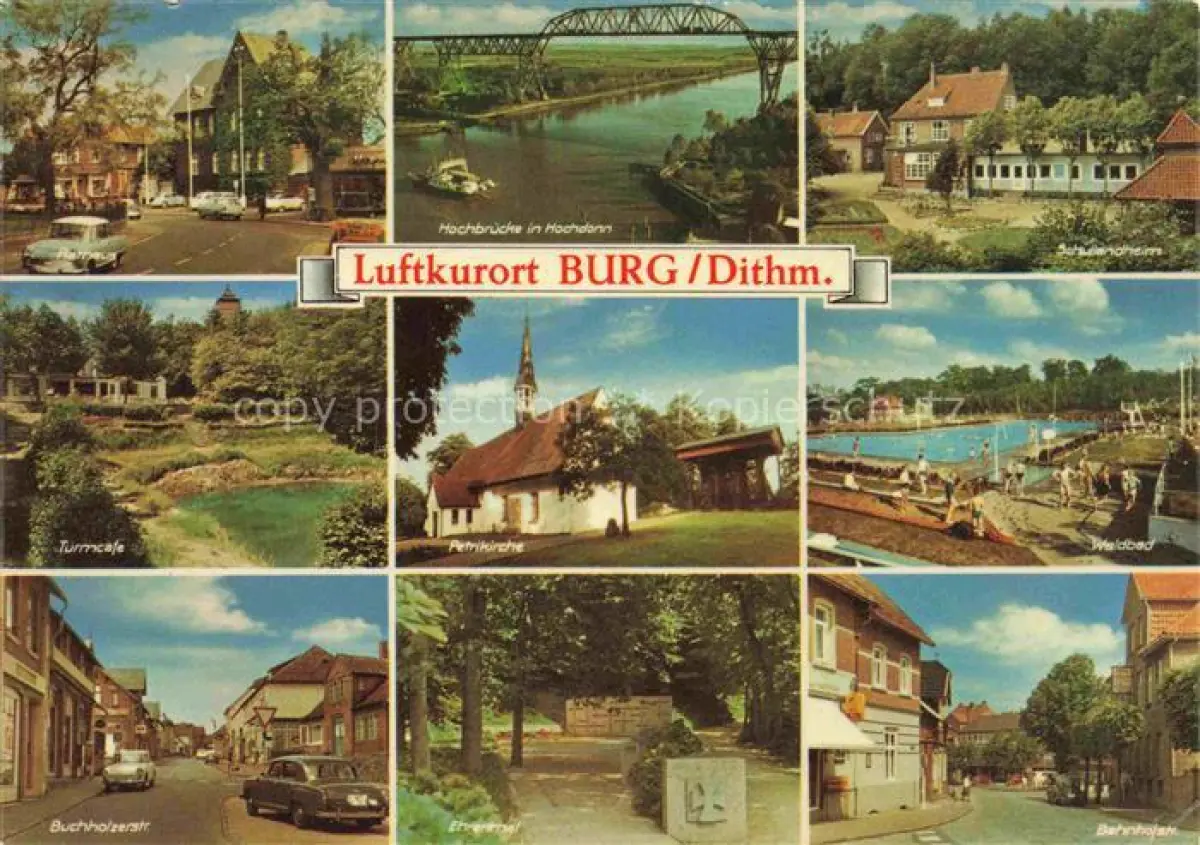 AK / Ansichtskarte Burg Dithmarschen Rathaus Hochbruecke Cafe Kirche Ehrenmahl Bahnhofstrasse
