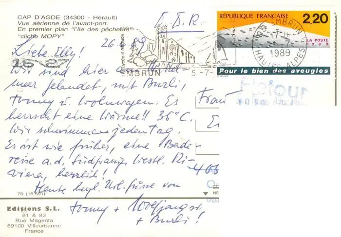 Cap-d_Agde L'avant port Ile des pêcheurs vue aérienne Cap-d_Agde postalisch gelaufen 1989 Fliegeraufnahme Erhaltung siehe scans [FriedD77] Fliegeraufnahme Frierer