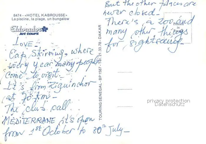 Cap_Skirring Hotel Kabrousse Swimming Pool Strand postalisch nicht gelaufen nach 1965 Erhaltung siehe scans [FriedD77] Frierer