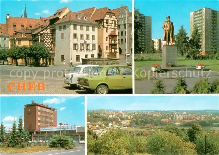 AK / Ansichtskarte Cheb_Eger Altstadt Lenin Denkmal Statue Bahnhof Stadtpanorama