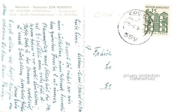 Cochem_Mosel Gaststaette Zum Rebstock Aussenansicht m. Terrasse Cochem Mosel postalisch gelaufen 1965 Erhaltung siehe scans [LiesaD40] LiesID40