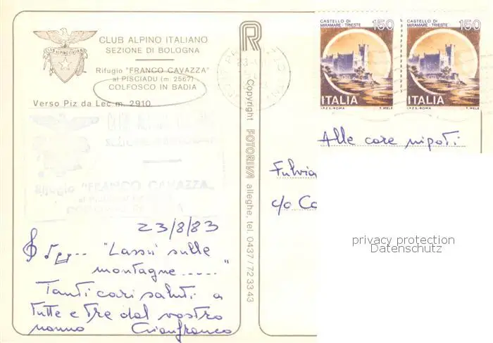 Colfosco_in_Badia_1645m_Dolomiti_IT Rifugio Franco Cavazzaet Pisciadu postalisch gelaufen nach 1965 Erhaltung siehe scans [FriedD77] Frierer