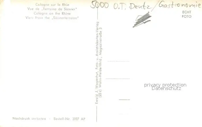 Cologne_Koeln_Rhein Vue de Terrasse de Suenner Cologne_Koeln_Rhein postalisch nicht gelaufen 1921-1965 Erhaltung siehe scans [WerneD78] WernPID7