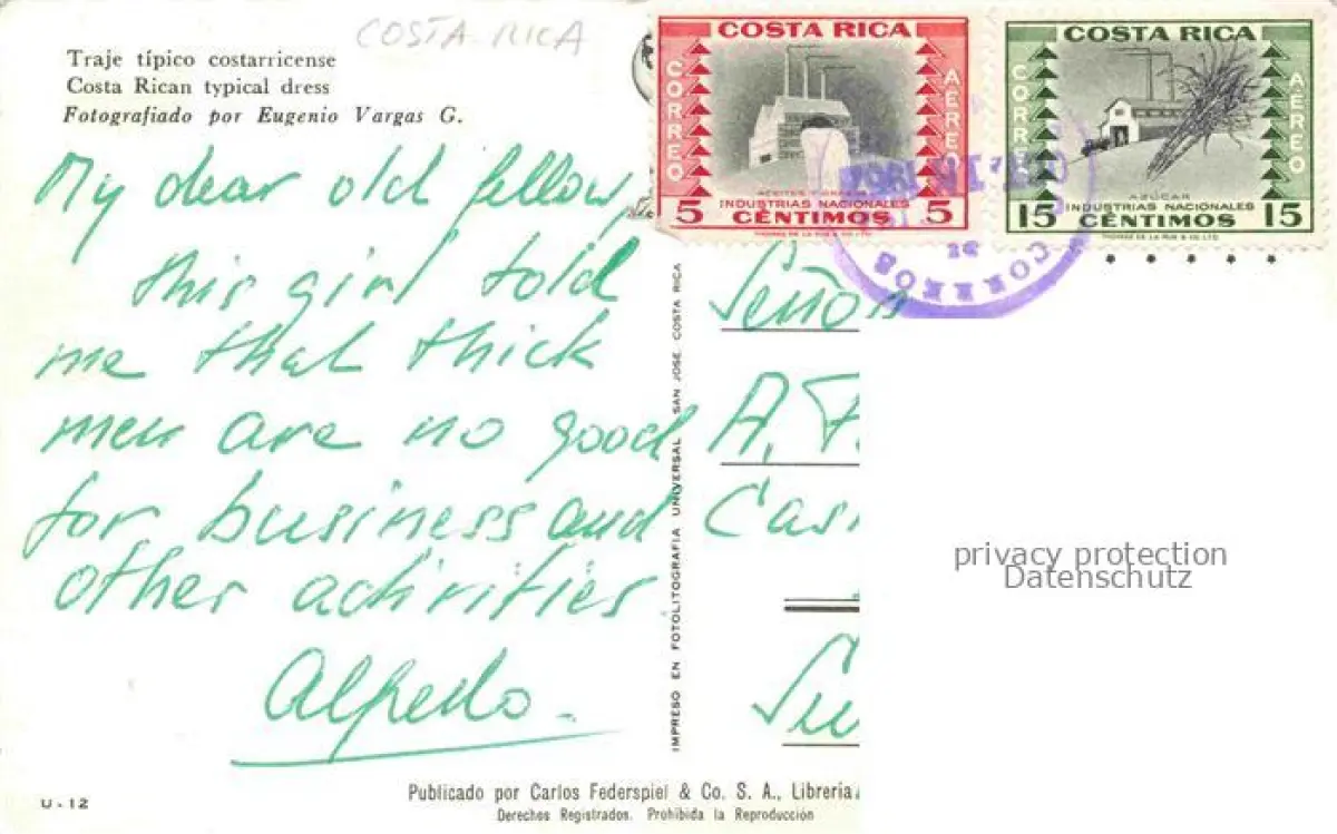 old postcard Costa Rica Traje típico costarricense postalisch gelaufen Erhaltung siehe scans [FriedD77]