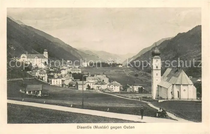 Disentis_GR Panorama mit Kirche Disentis GR postalisch gelaufen 1912 Erhaltung siehe scans [FriedD77] Frierer