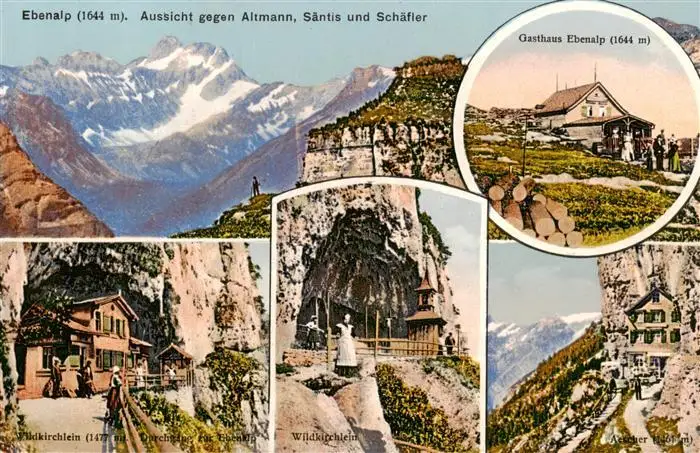 Ebenalp_1641m_AI mit Altmann Saentis und Schaefler Gasthaus Ebenalp Felskirchlein Wildkirchlein Aescher postalisch nicht gelaufen nach 1965 Erhaltung siehe scans [FriedD77] Frierer