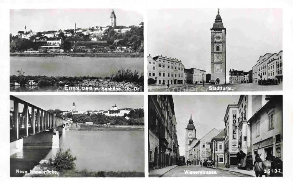 Enns Oberoesterreich AT Panorama Stadtturm Partie an der Enns Neue Bruecke Wienerstrasse postalisch nicht gelaufen Erhaltung siehe scans [FriedD77]