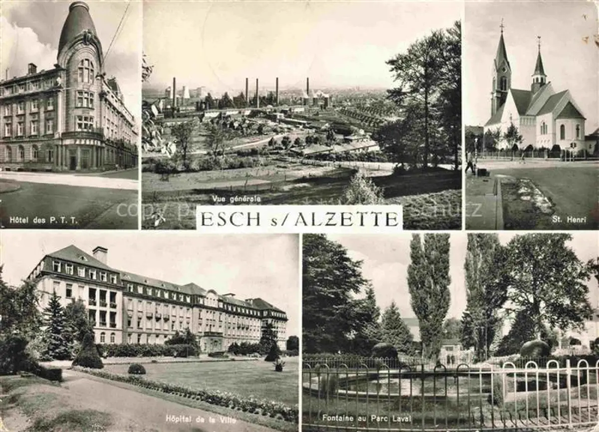 AK / Ansichtskarte Esch-sur-Alzette Luxembourg Hotel des PTT Vue generale St Henri Hopital de la Ville Fontaine au Parc Laval