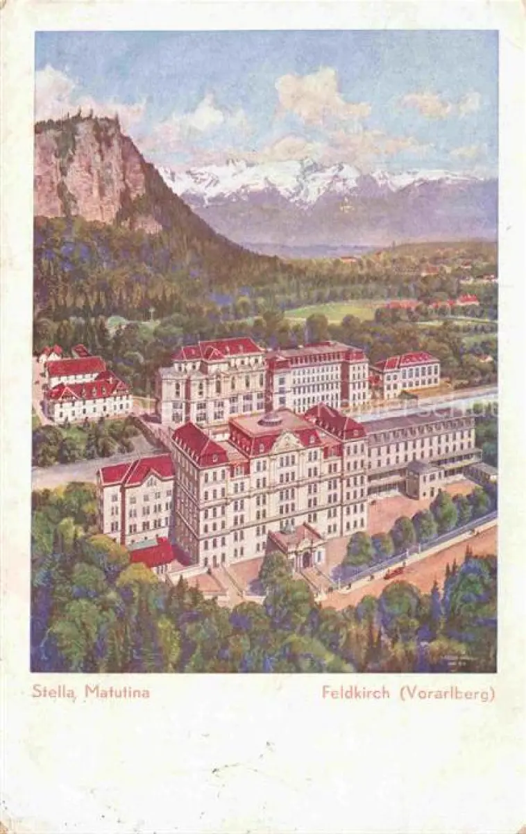 14102420 Feldkirch Vorarlberg AT Stella Matutina Privatgymnasium des Jesuitenordens aus der Vogelperspektive Illustration postalisch gelaufen Erhaltung siehe scans [FriedD77] alte Postkarte Frie Katcode 11390342080404