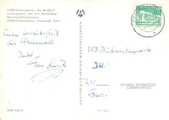 Frauenwald_Thueringen FDGB Erholungsheime Am Bergbad Auf dem Sonnenberg Rennsteig Wanderhuetten FDGB Erholungsheim Raymonde Dien Frauenwald Thueringen postalisch gelaufen 1983 Erhaltung siehe scans [FriedD77] Frierer