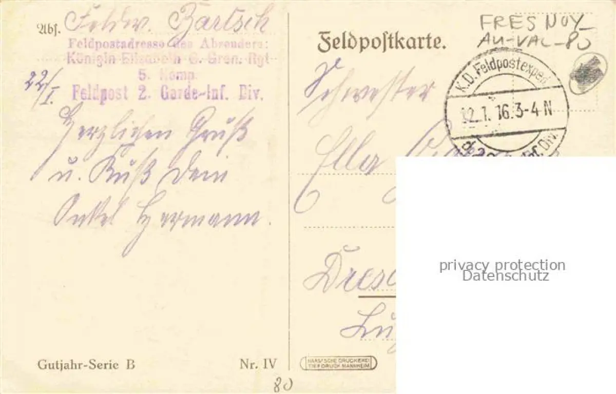 14108718 Fresnoy-au-Val AMIENS 80 Somme Doppelposten for Fresnoy Kuenstlerkarte Gutjahr-Serie B postalisch gelaufen Feldpostexpedition (Stempel) Erhaltung siehe scans [FriedD77] Feldpostexpedition (Stempel) alte Postkarte Frie Katcode 11170080280357