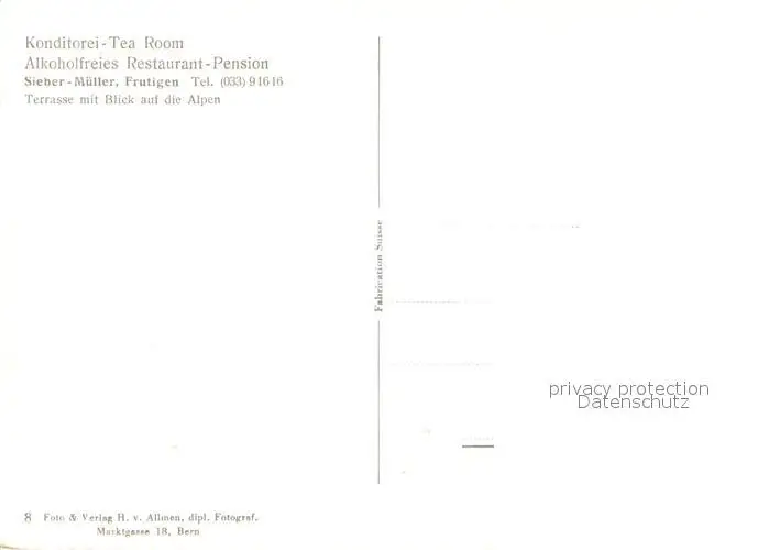 Frutigen_BE Konditorei Tea Room Restaurant Pension Sieber Mueller Terrasse Alpenblick Frutigen BE postalisch nicht gelaufen nach 1965 Erhaltung siehe scans [FriedD77] Frierer