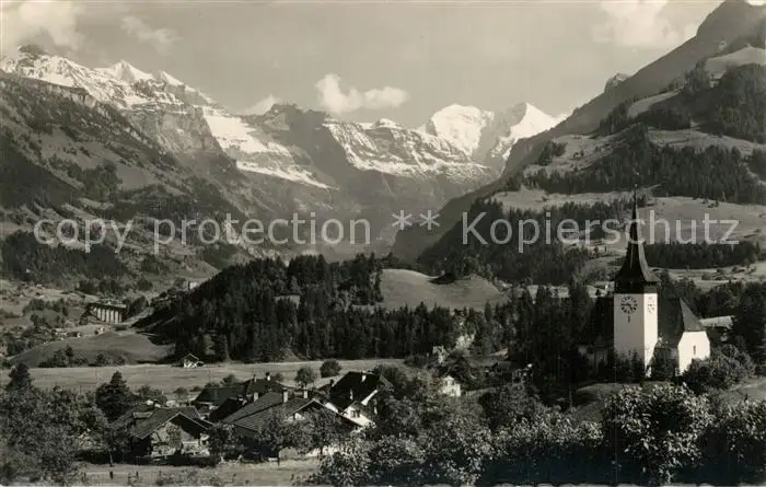 Frutigen_BE Ortsansicht mit Kirche Blick zu Doldenhorn Balmhorn Altels Berner Alpen Frutigen BE postalisch gelaufen 1937 Erhaltung siehe scans [FriedD77] Frierer
