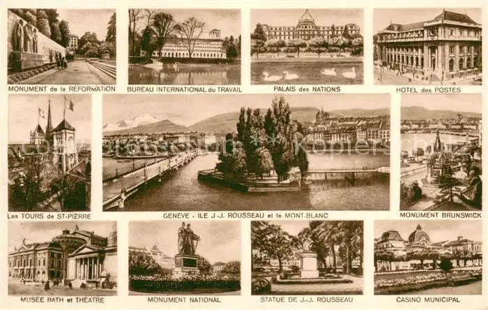 AK / Ansichtskarte Geneve_GE Palais des Nations Hotel des Postes Ile JJ Rousseau Musee Rath et Theatre Monument National Casino Municipal Geneve_GE