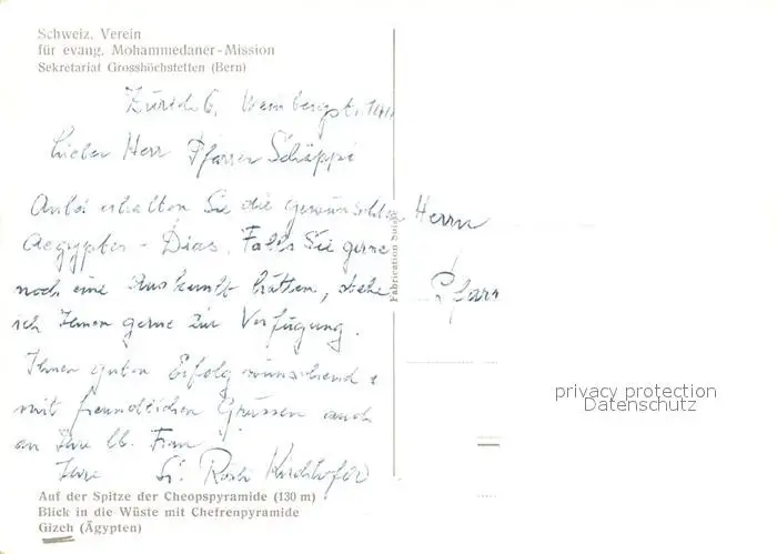 Gizeh Schweiz. Verein fuer evang. Mohammedaner-Mission auf der Spitze der Cheops-Pyramide Gizeh postalisch nicht gelaufen nach 1965 Erhaltung siehe scans [LiesaD40] LiesID40