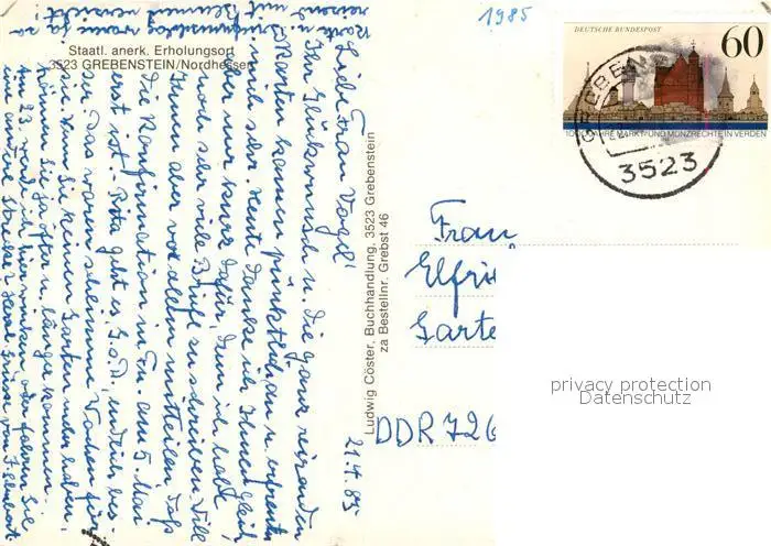 Grebenstein Ortsansicht mit Kirche Turm Fachwerkhaeuser Grebenstein postalisch gelaufen 1985 Erhaltung siehe scans [FriedD77] Frierer