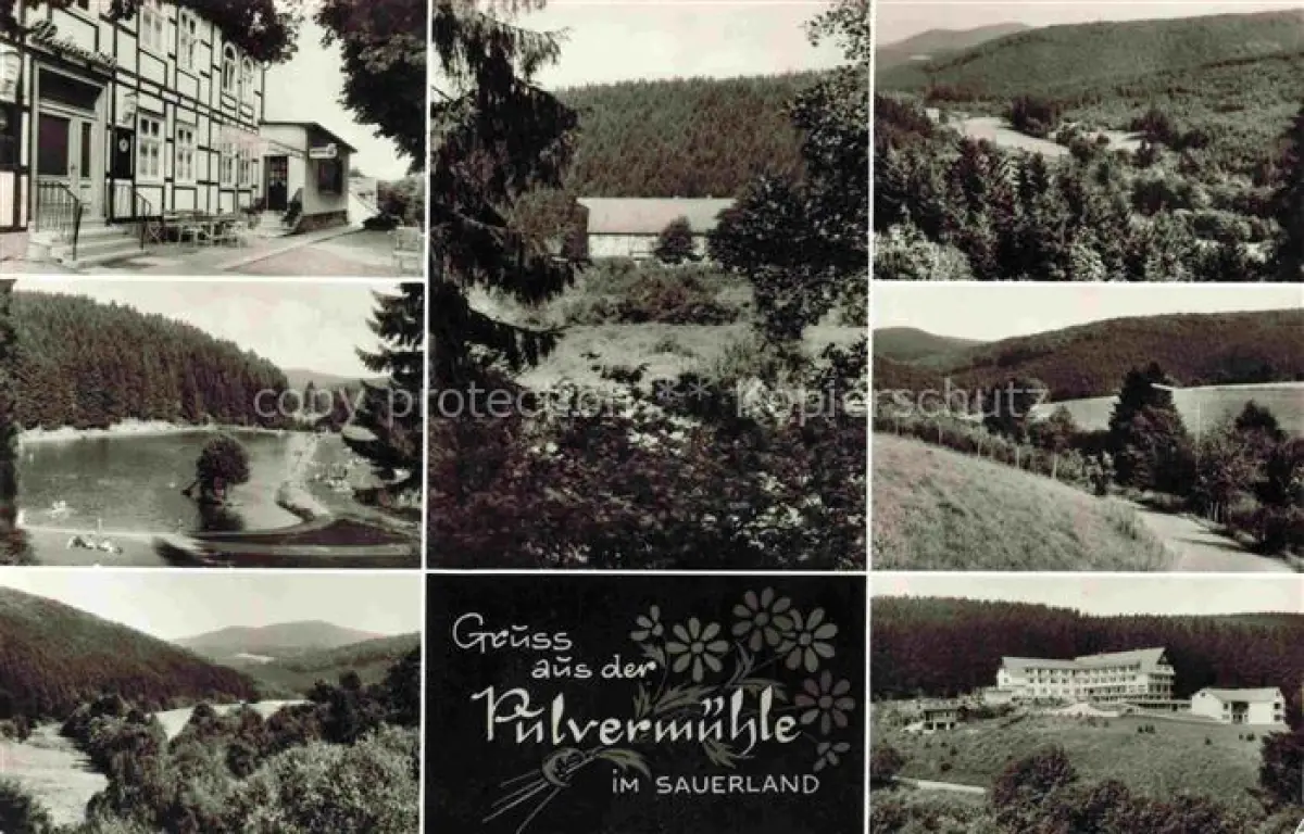 AK / Ansichtskarte Gudenhagen Brilon Hochsauerlandkreis NRW Gaststaette Zur Pulvermuehle Schwimmbad Panorama Teilansichten