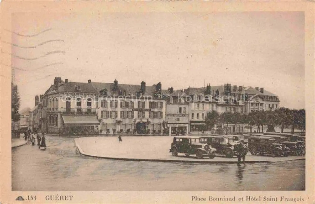 14107698 Gueret 23 Creuse Place Bonniaud et Hôtel Saint Francois postalisch gelaufen Erhaltung siehe scans [FriedD77] carte postale Frie Katcode 11170023223096