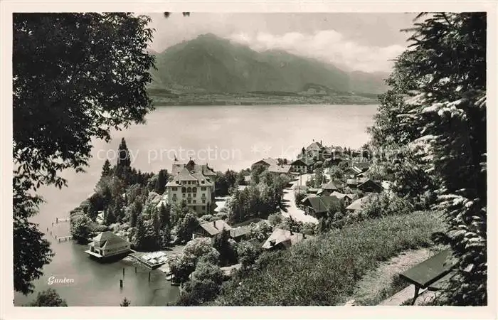 14069722 Gunten Thunersee BE Panorama Blick ueber den Thunersee Alpen postalisch gelaufen Erhaltung siehe scans [FriedD77] alte Postkarte Frie Katcode 11470060240786