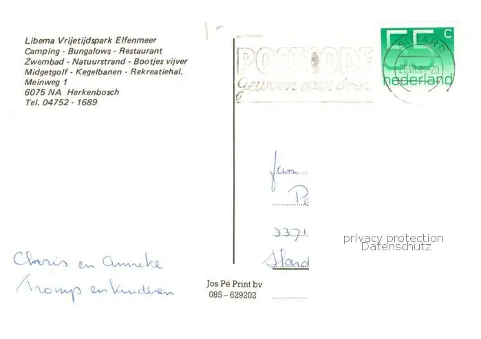 Herkenbosch Libema Vrijetijdspark Elfenmeer Camping-Bungalows-Rest.- Minigolf-Kegelbahn-Naturstrand Herkenbosch postalisch gelaufen 1989 Erhaltung siehe scans [LiesaD40] LiesID40