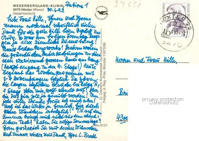 Hoexter_Weser Weserbergland Klinik Fliegeraufnahme Hoexter Weser postalisch gelaufen 1992 Erhaltung siehe scans [WerneD78] WernPID7