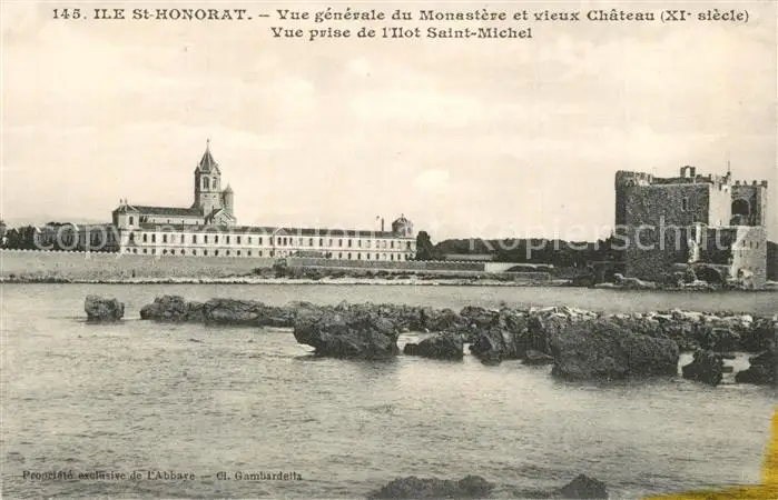 Ile_Saint-Honorat_Alpes_Maritimes Vue générale du Monastère et vieux château XIe siècle vue prise de l'Ilot Saint Michel Ile_Saint-Honorat postalisch nicht gelaufen bis 1920 Erhaltung siehe scans [FriedD77] Frierer