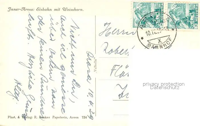 Inner_Arosa Eisbahn mit Weisshorn Inner Arosa postalisch gelaufen 1939 Erhaltung siehe scans [WerneD78] WernPID7