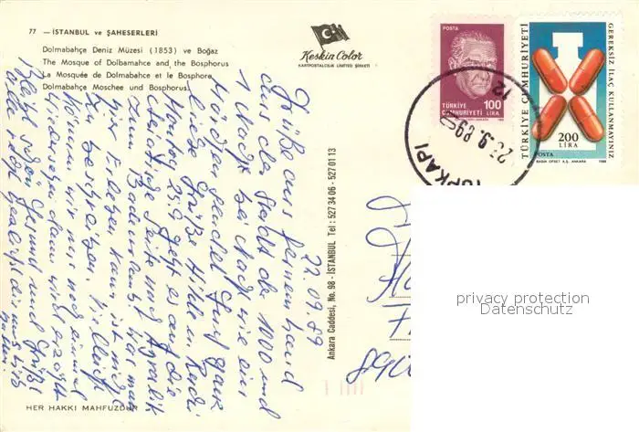 Istanbul_Constantinopel Dolmabahce Moschee und Bosphorus Istanbul_Constantinopel postalisch gelaufen 1989 Erhaltung siehe scans [FriedD77] Frierer
