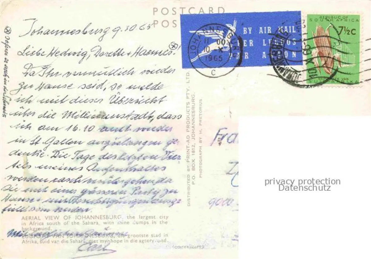 old postcard JOHANNESBURG Gauteng Southafrica RSA Air view postalisch gelaufen Erhaltung siehe scans [WerneD78]