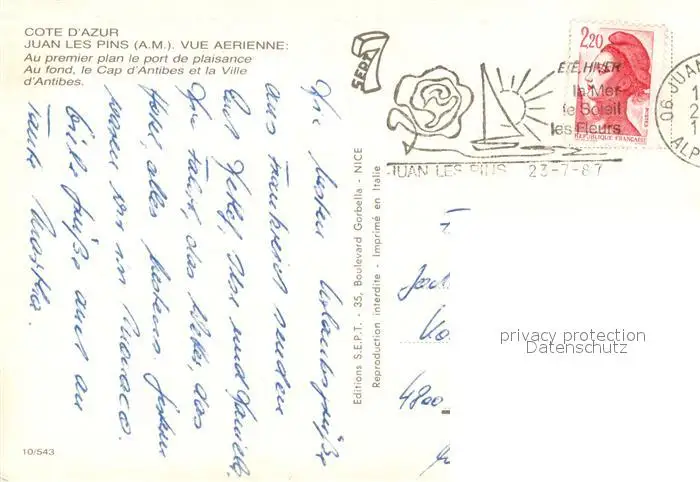 Juan-les-Pins Vue aerienne Cap d’Antibes et la Ville d'Antibes Juan-les-Pins postalisch gelaufen 1987 Erhaltung siehe scans [WerneD78] WernPID7