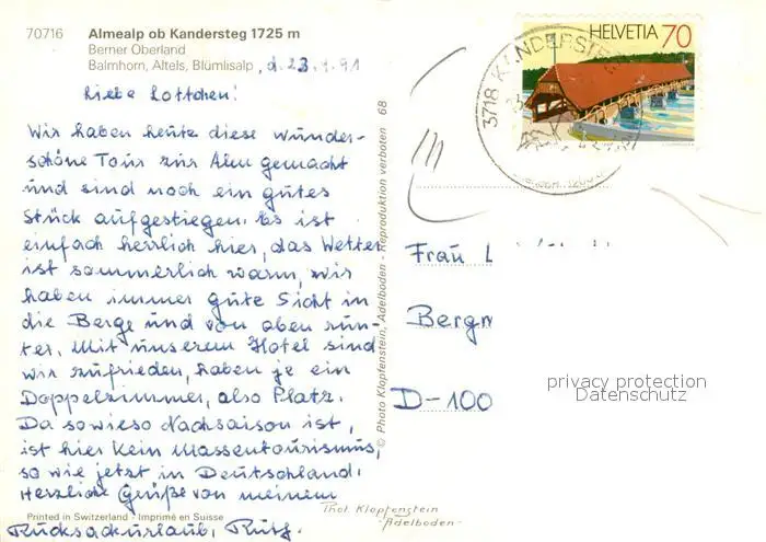 Kandersteg_BE Almealp Berner Oberland Bergbahn Berner Alpen Kandersteg_BE postalisch gelaufen 1991 Erhaltung siehe scans [FriedD77] Frierer