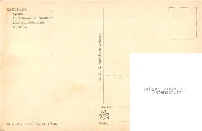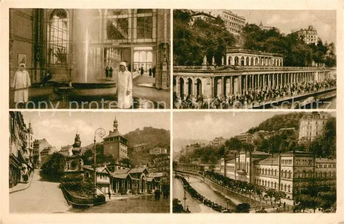 Karlsbad_Eger Sprudel Marktbrunn Stadtturm Muehlbrunnkolonnade Kurhaus Karlsbad_Eger postalisch nicht gelaufen 1921-1965 Erhaltung siehe scans [WerneD78] WernPID7