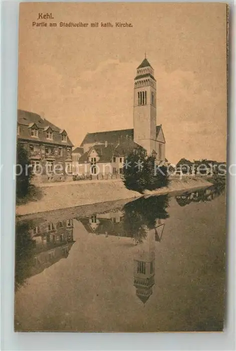 Kehl_Rhein Stadtweiher mit Kath. Kirche Kehl_Rhein postalisch nicht gelaufen bis 1920 Erhaltung siehe scans [LiesaD40] LiesID40