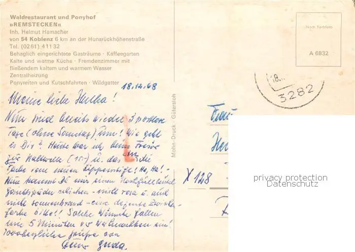 Koblenz__Rhein Waldrestaurant und Ponyhof Remstecken postalisch gelaufen 1968 Erhaltung siehe scans [WerneD78] WernPID7