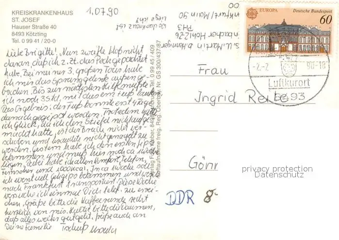 Koetzting Kreiskrankenhaus St Josef Fliegeraufnahme Koetzting postalisch gelaufen 1990 Erhaltung siehe scans [WerneD78] WernPID7