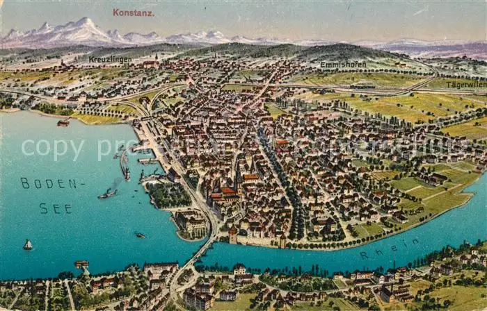 Konstanz_Bodensee aus der Vogelperspektive Kuenstlerlitho Konstanz_Bodensee postalisch nicht gelaufen bis 1920 Erhaltung siehe scans [FriedD77] Frierer