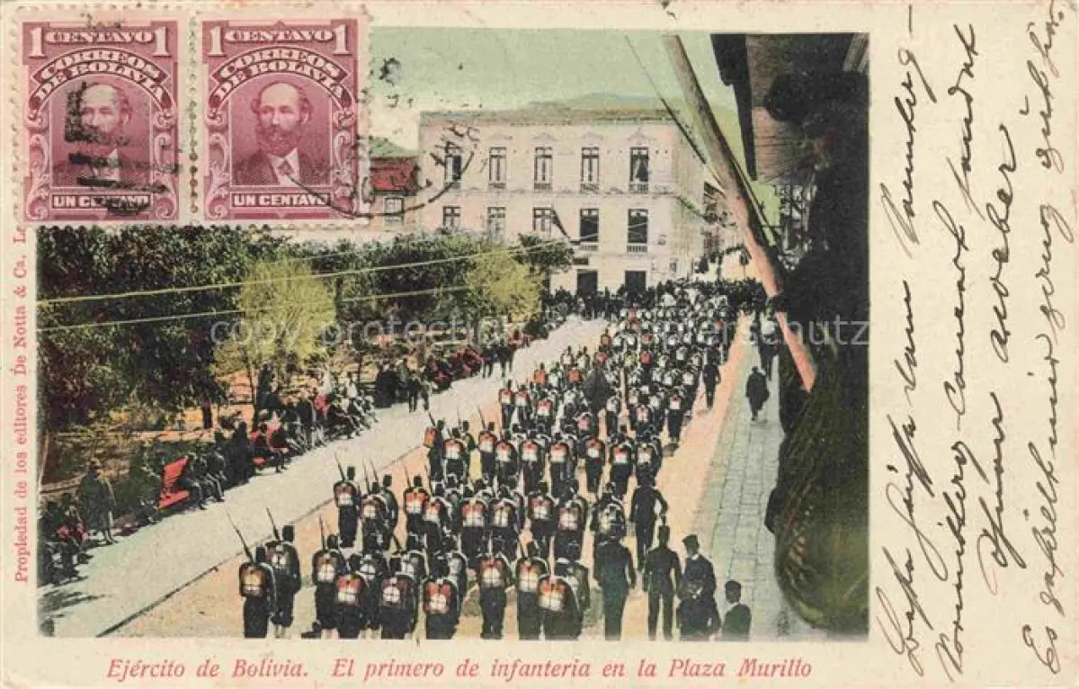 14102542 LA PAZ Bolivia El primero de infanteria en la Plaza Murillo postalisch gelaufen Erhaltung siehe scans [FriedD77] alte Postkarte Frie Katcode 17030
